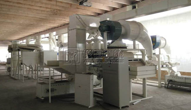 該機組主要由上料斗、原料提升機、多功能除雜機、斗式提升機、脫殼機(2臺)、復選機(3臺)、吸風回料系統、接料器、控制柜組成。 工藝流程